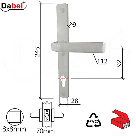 Dimenzije: razmak 92 mm, širina šilda 28 mm, visina 245 mm, debljina 9 mm, dužina ručice 112 mm.