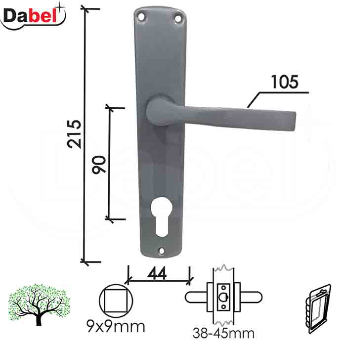 Dimenzije: razmak 90 mm, širina šilda 44 mm, visina 215 mm, debljina 7 mm, dužina ručice 105 mm.