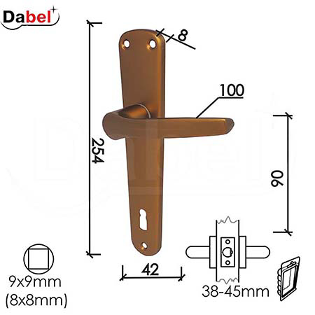 Predviđena je za montažu na drvena vrata debljine 38–42 mm, sa osovinom 9x9 mm (dostupna i opcija 8x8 mm).