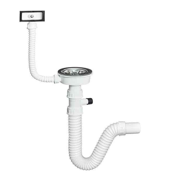 🛁 Fleksibilni sifon za dvodelnu sudoperu ⚪ Dva inox ulivna grla sa rešetkom 💧 Prelivno grlo sa zaptivnom gumicom 🚿 Priključak za mašinu za pranje sudova 🔒 Rešetkasti umetak sa funkcijom čepa 📏 PVC cev Ø40 mm glatka iznutra 🔧 Adapteri za Ø50 mm i 5/4" cevi