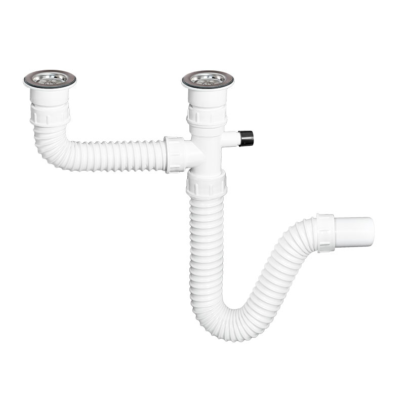 🧼 Sifon za dvodelnu sudoperu 🔁 Priključak za mašinu za sudove 🔒 Konusni spoj – sigurno zaptivanje 🧪 Zaptivke za nepropusnu vezu 🔗 Gibljiva creva: 500 mm i 300 mm ⭕ Rešetka sifona Ø65 mm 📏 Dimenzije: 790x190x80 mm ⚖️ Težina: 422 g 🧪 Materijali: AISI 304, PP, PVC 📄 Standard: SRPS EN 274
