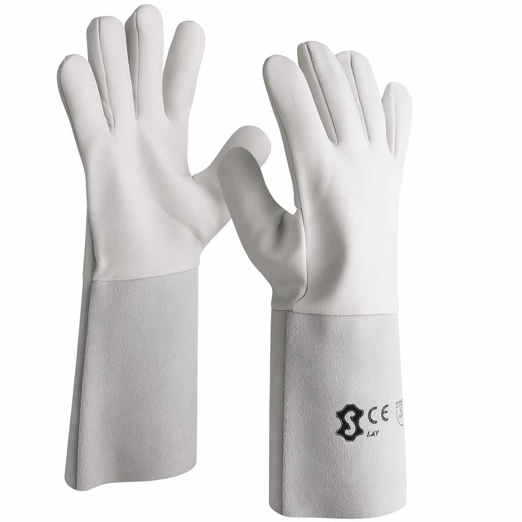 Rukavice za TIG/argonsko zavarivanje Meka jagnjeća koža, manžeta od špalt kože Kevlar® ojačani šavovi Otpornost na kontakt s toplinom do 100°C Ukupna dužina 35 cm Standardi: EN 388, EN 407, EN 12477 Tip B